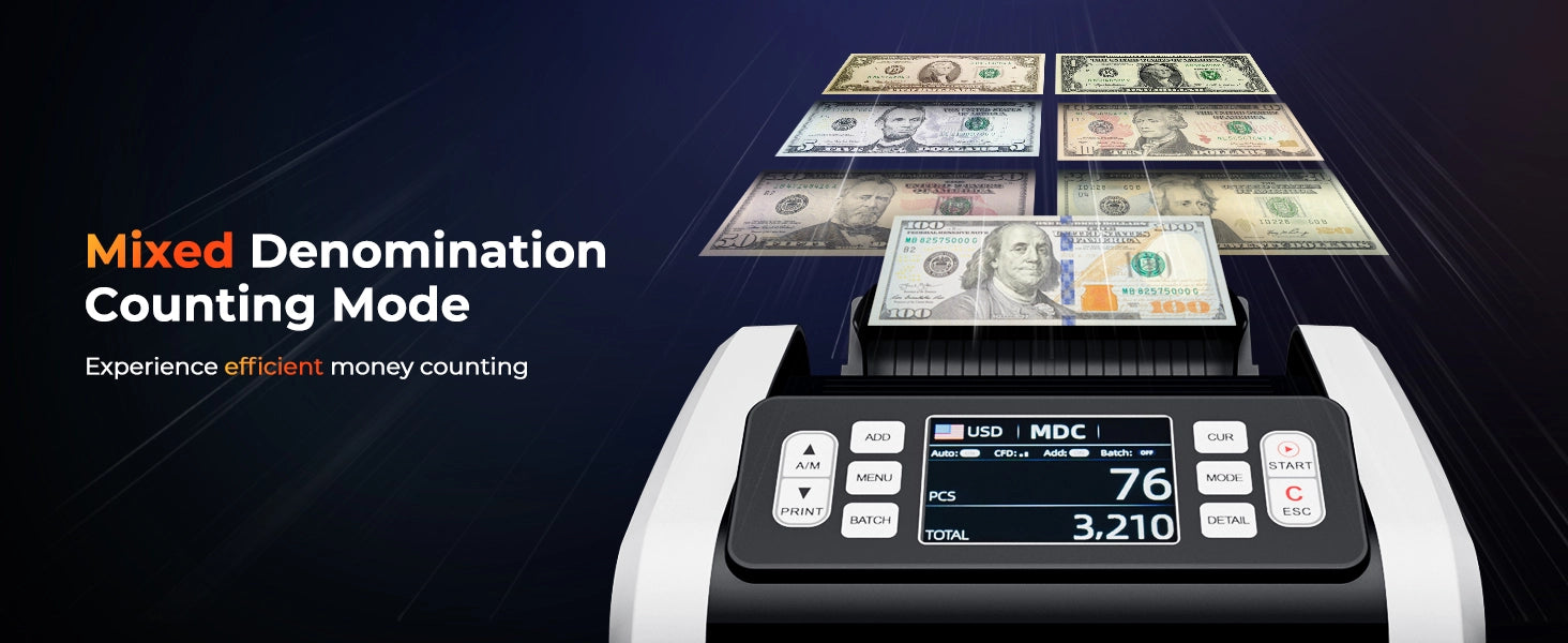 - [Mixed Denomination & Multi Currency] Just put your money into the machine and turn it into mixed denomination Counting mode(MDC mode). This mixed denomination money counter machine will give you the value and quantity of the banknotes. Besides, IMC09 supports multi-currency value counting(GBP/EUR/USD/MXN/CAD.etc) and is equipped with a 89mm TFT display screen.