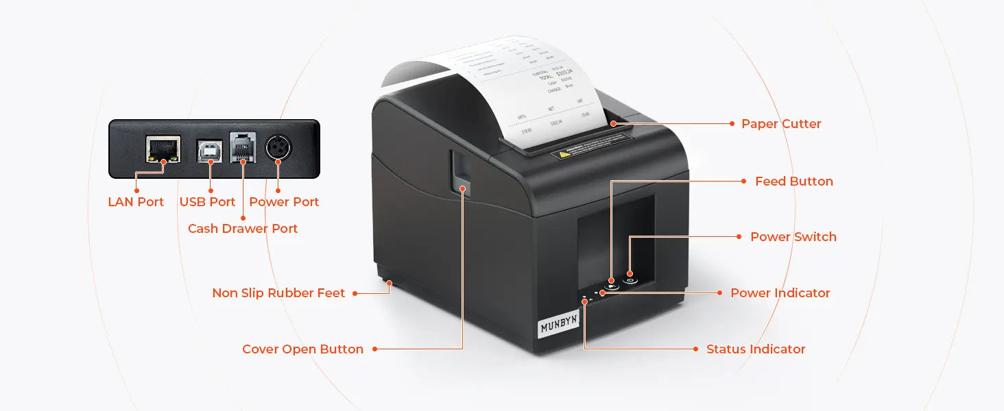 - 【USB or Ethernet Connection】Compatible with ESC/POS printing commands and supports cash drawers. Four Ports: USB+ LAN + Cash Drawer+ Power Port. It supports Windows x86, ARM, MacOS, Android, ChromeOS, and Linux.