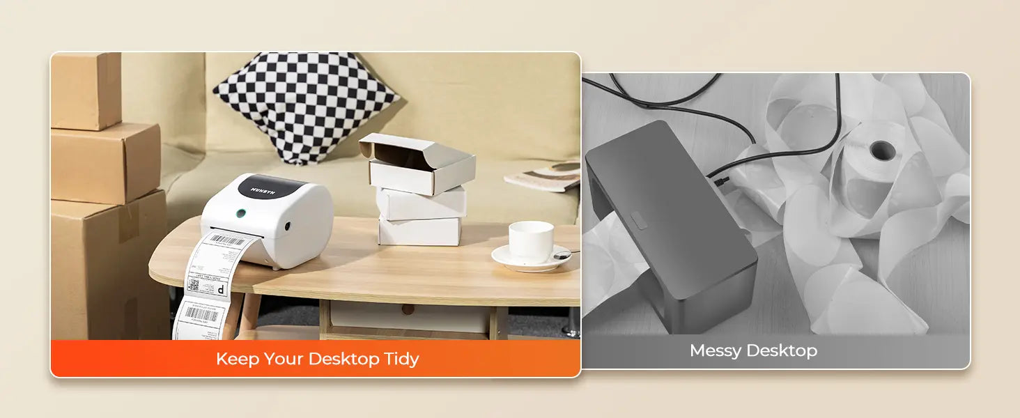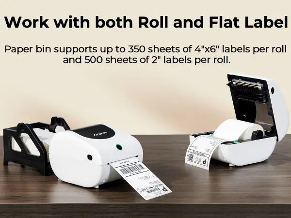 - High-Efficiency Compact Shipping Label Printer: MUNBYN Bluetooth thermal label printer features a large-capacity paper tray design. The revolutionary design supports both internal roll paper (up to 350 labels) and folded paper loading from the back without needing an extra holder. This flexibility saves desktop space and significantly enhances work efficiency, making every inch of space count.