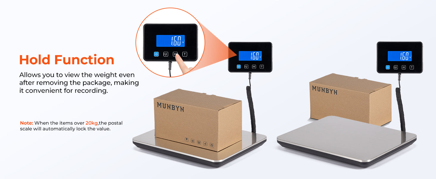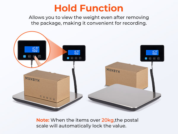 - Convenient Hold Function for Easy Use: The Munbyn 440lbs postal scale features a handy Hold Function that locks the weight on the screen, perfect for recording without rushing. For items over 20kg, it auto-locks the weight. Easily reset with the "T" key for the next use, making it a must-have shipping scale for small packages and small businesses.