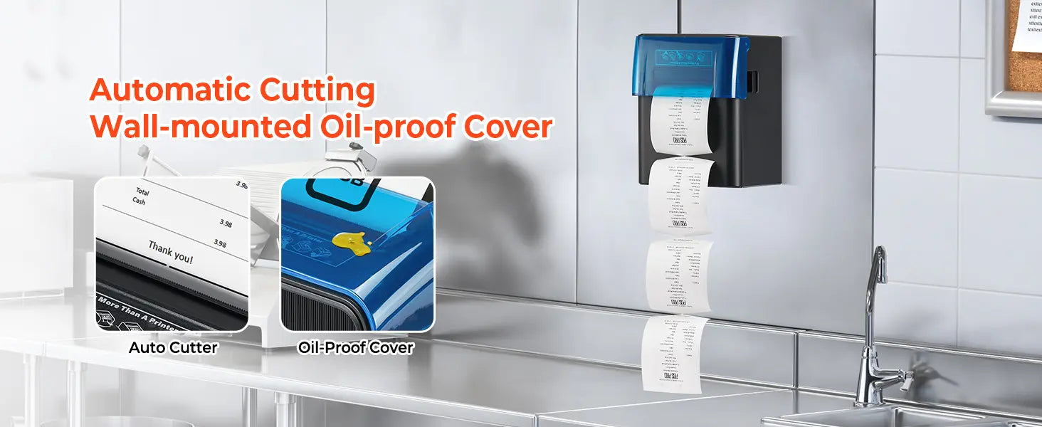 【Wall-Mounted Oil-Proof Cover】: Equipped with two hanging holes at the bottom, offering wall or stand mounting options to save space. The top comes with an oil-proof cover available in two colors (blue/black) to protect your receipts even in harsh environments. Large capacity makes paper changes easier. A buzzer alarm ensures you never miss an order, even in noisy settings!
